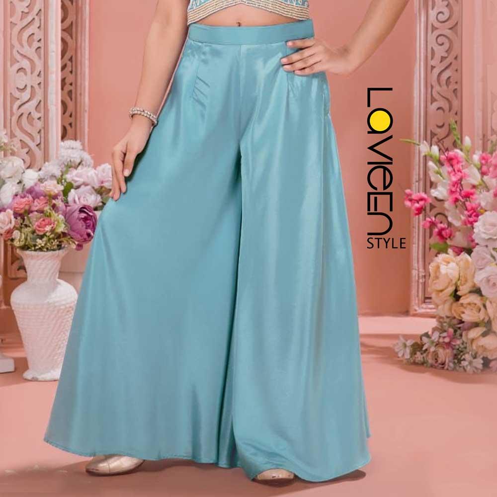 Design Highlights: A sophisticated sky-blue ensemble that balances a heavily textured, hand-worked top with the clean, elegant lines of satin-finish sharara pants. The top features a modern V-cut waistline that complements the flared silhouette of the trousers.